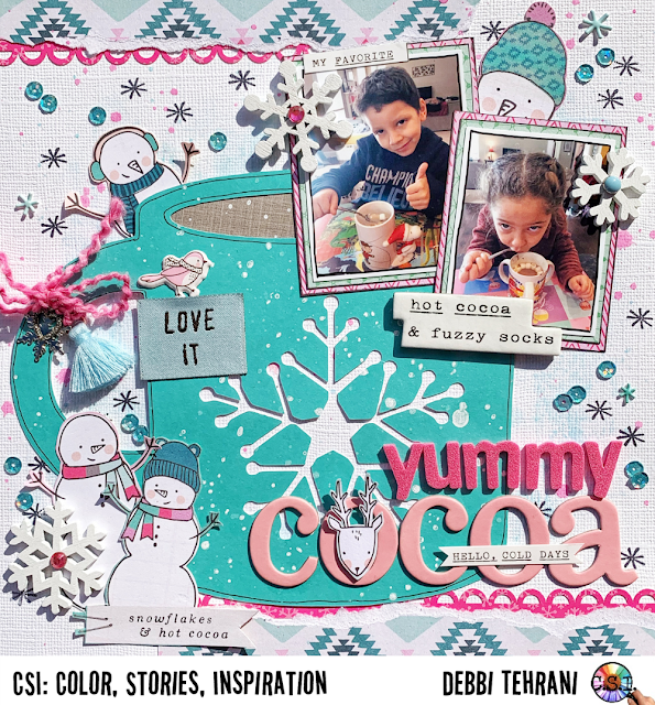 Here are some details. The big mug is a FREE cut file from Paper Issues. I tied some silver charms (a heart and a snowflake) and a tassel on with some old fiber. I added a fabric label and a puffy sticker. The snowmen and patterned papers are from Snow and Cocoa by Crate Paper. I will never get tired of using this fun collection. You can see the snowflakes are wooden and I added some shiny rhinestones for additional clues..