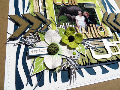 I wanted to add a little whimsy to my page because any day spent with Tracee is filled with fun and mischief. The little monkey is cut from a BasicGrey paper. I raided my stash of old papers in search of textured papers and rediscovered some mulberry and corrugated paper, as well as a faux animal print, which I snipped with scissors to make fringe. I thought the letters looked sort of like wood--they're by K&Co.