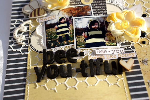 I bought that bee paper, by Carolee's Creations a few years ago after a fiasco when yellow jackets had built a nest on my porch seat and I got stung, but I've never made that page. I'm glad I had it in my stash for this page!